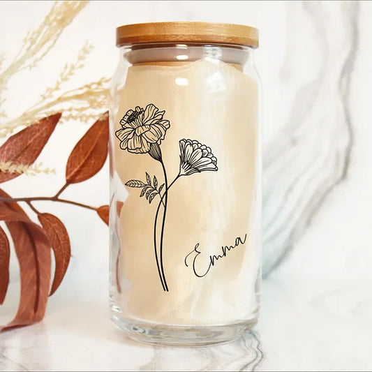 Personalisierte Geburtsblumen-Tumbler-Glasdose mit Bambusdeckel und Strohhalm