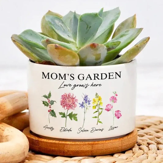 Personalisierter Blumentopf „Mom's Garden“, individueller Geburtsmonat, Blumenfamilie